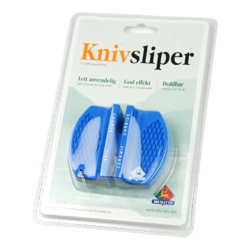 Knife Sharpener fra Brusletto er en meget god og hendig lettvekts knivsliper. Kan slipe alle typer kniver uten serratering og med blad i stål. Karbid for grovsliping på den ene siden og keramiske staver for finsliping på den andre siden.