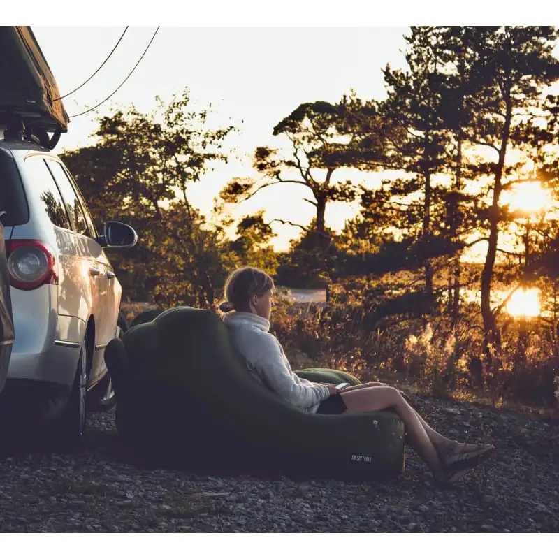 Chair fra Softybag er en stol som er lett å blåse opp ved å feie den gjennom luften. Nyttig om du skal til stranden, fotturer i fjellet eller bare vil slappe av foran TV-en.