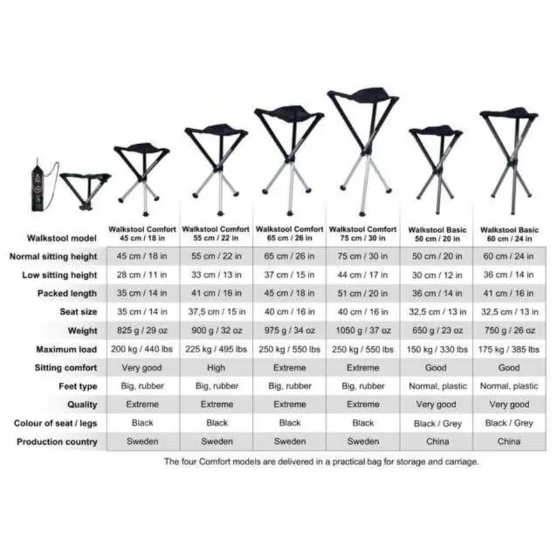 Møt stolen som går. Som følger deg samme hvor du går og likevel ikke er større enn at den får plass i vesken. Felles opp med enkle håndgrep. Dra ut bena, fell ut. Står støtt overalt. God å sitte på – en hel kamp, en hel konsert, timer på jakt, ved fiskestanga eller i den uendelige køen. Og på jobben! Spør den som ofte må jobbe sittende på huk. Walkstool sparer rygg, knær og ledd. Det kan mange bekrefte i dag. To sittehøyder. Varier etter behov. En utmerket gave. Begynn med å